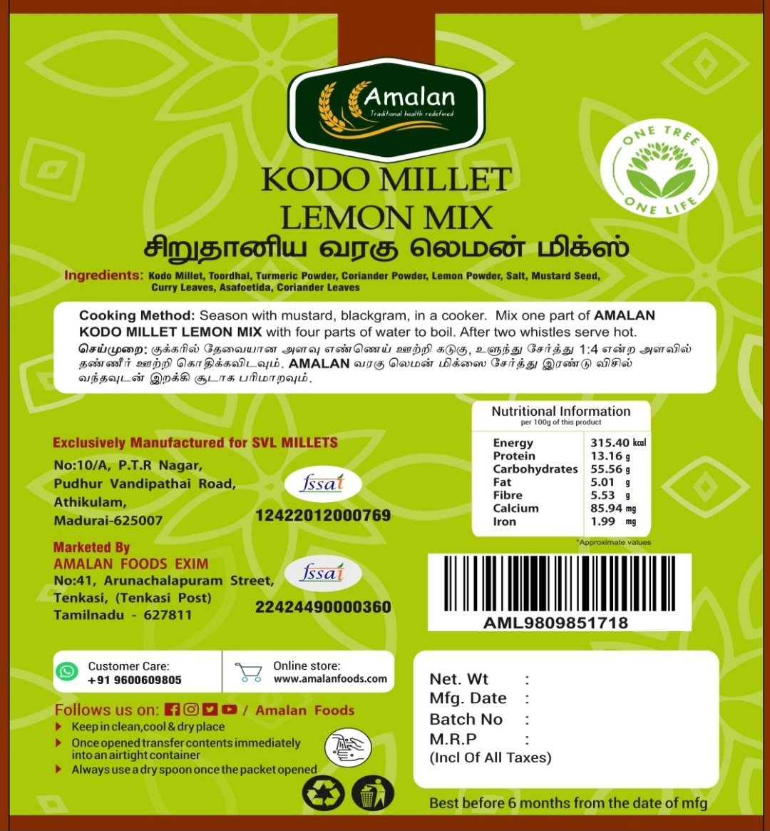 Season with mustard, blackgram, in a cooker. Mix one part of AMALAN KODO MILLET LEMON MIX with four parts of water to boil. After two whistles serve hot.