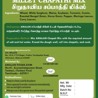 🌾Millet Chapathi Mix – Healthy chapathis made simple. Enjoy soft, tasty and nutritious chapathis with Amalan Foods Millet Chapathi Mix. Made with carefully selected millets, this mix helps you prepare wholesome chapathis in just minutes—perfect for everyday meals. No complicated steps, no compromise on taste. Just add water, knead, and cook to enjoy traditional goodness…